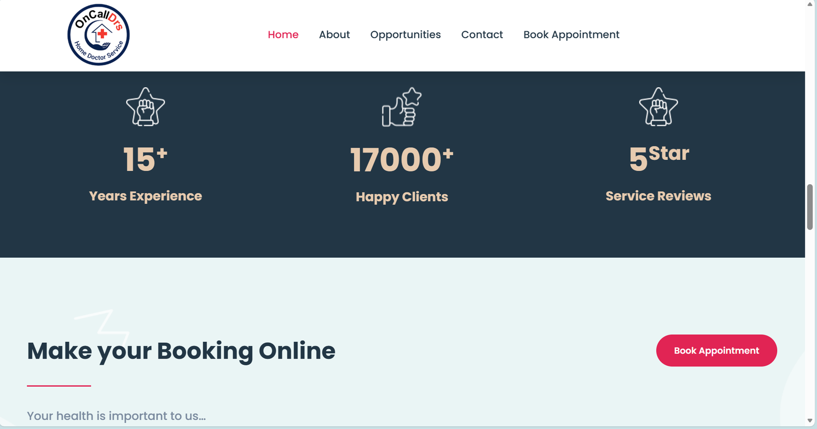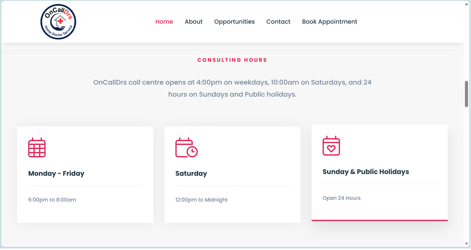 Solution: We implemented a streamlined booking system integrated with a call centre dispatch model, allowing triage by clinical need. The platform supports both immediate telehealth consultations and scheduled home visits, ensuring patients always have a pathway to care regardless of time or location.