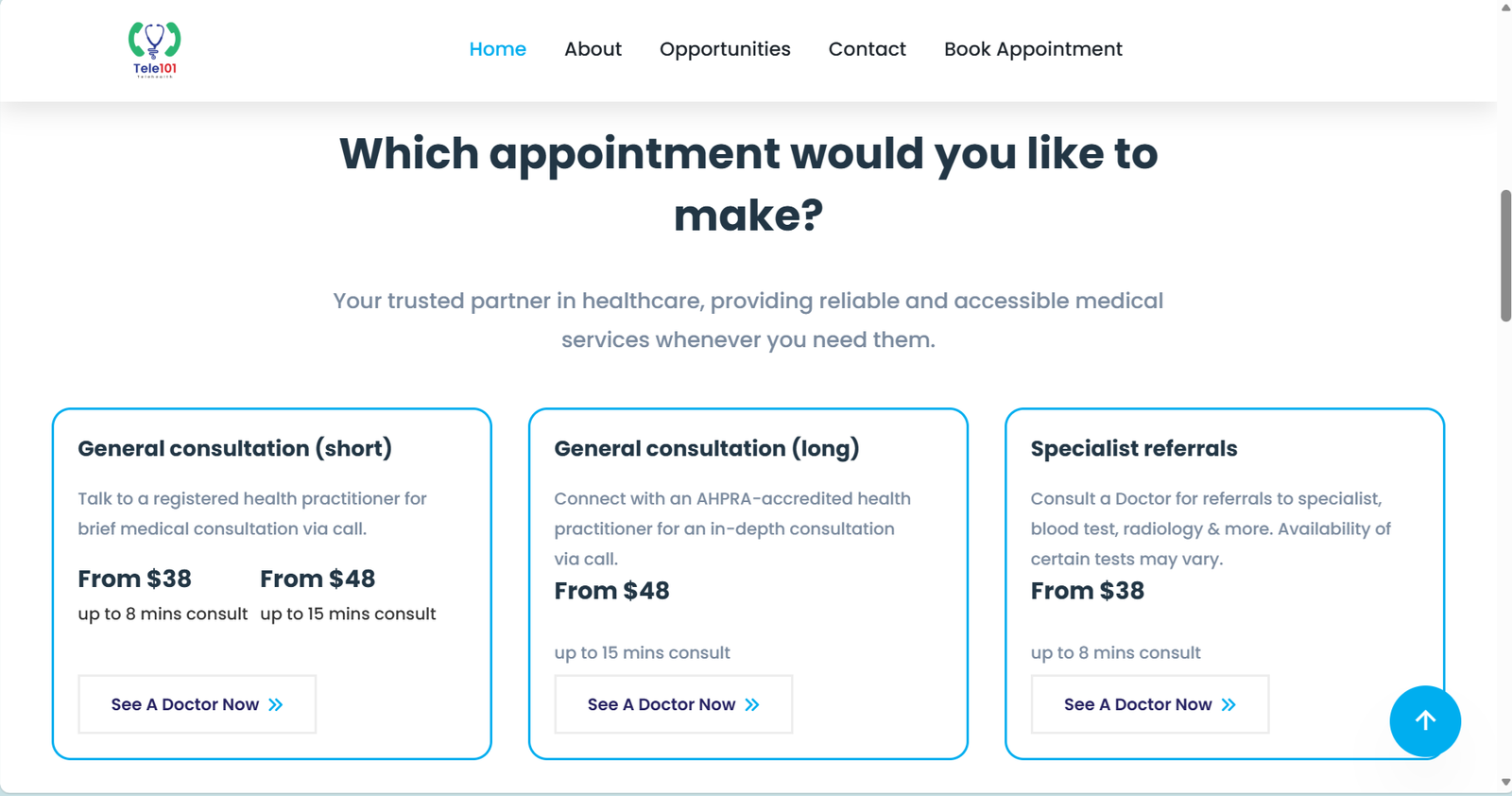 Solution: We developed a streamlined booking and consultation workflow that connects patients with available AHPRA-accredited practitioners in real time, using evidence-based national guidelines. The platform supports multiple consultation types — from short GP calls to specialist referrals — all accessible from a single interface with no referral required.